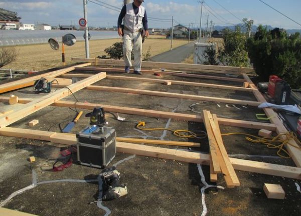 陸屋根の雨漏りでお悩みの方は勾配修正を行い軽い屋根材のガルバリウム鋼板使った工事がお勧めです。